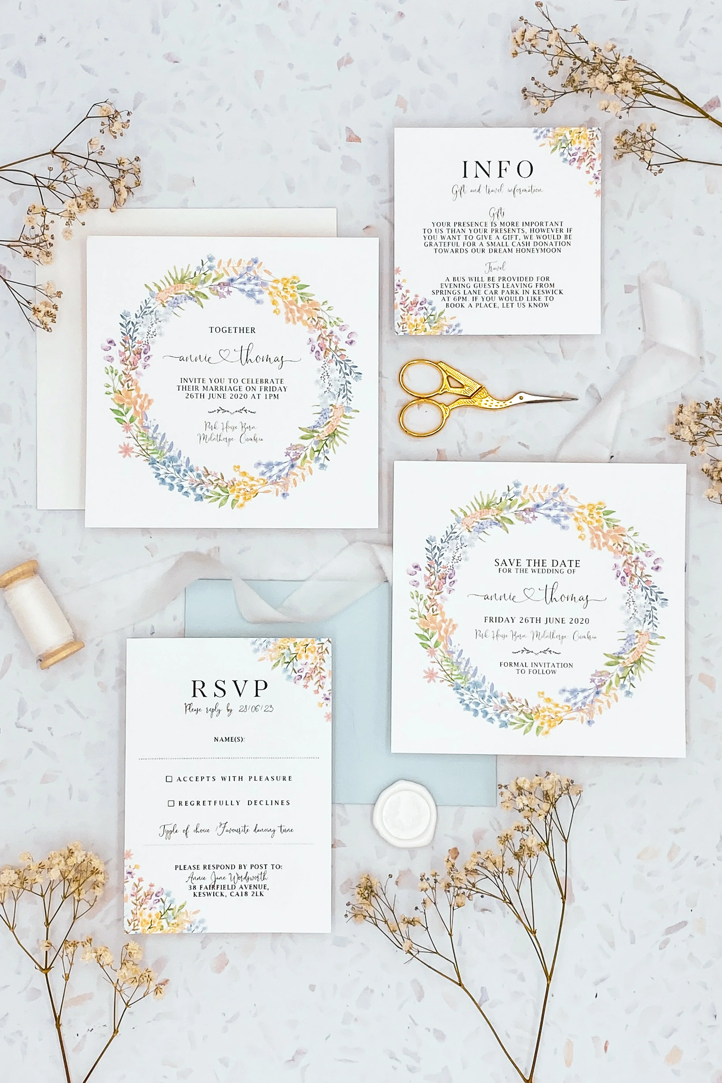 Our Annie Suite features a hand painted wreath full of wild meadow flowers, the colours of which can be altered to match your bouquet colour scheme. The fun typefaces keep the design looking fresh and airy.