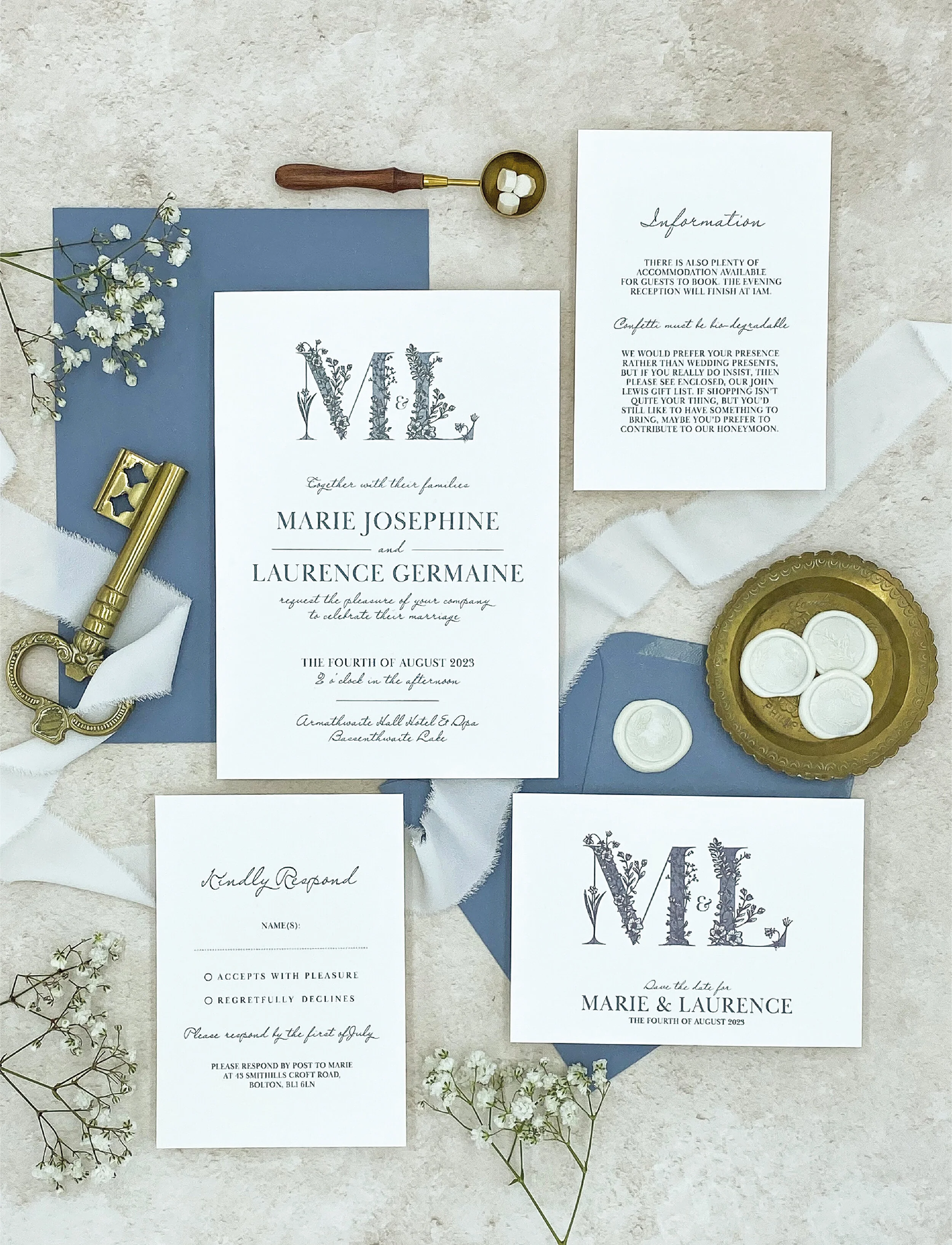 Our Marie Suite features your initials in an illustrated floral style. Combined with the classic typography, an elegant aesthetic is created. The colour of your initials can be altered to match your colour scheme.