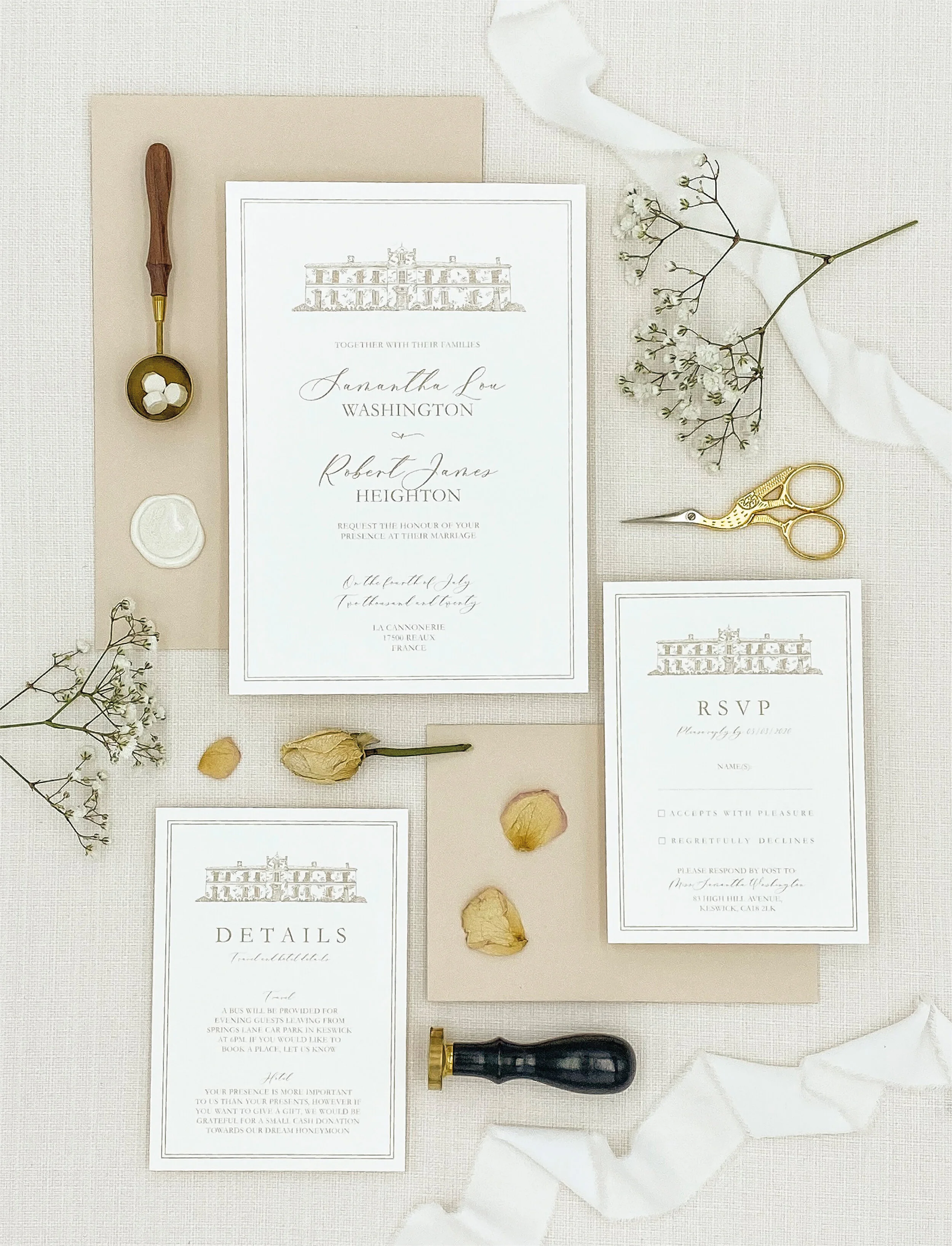 Our Samantha Suite has an elegant aesthetic, the traditional style of typography combined with the hand illustrated venue sketch make this a really beautiful collection. By having your venue as a feature it provides you with a design that only a few people will have.
